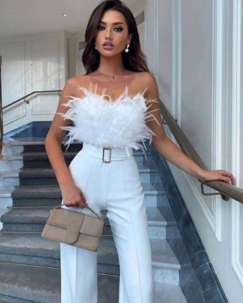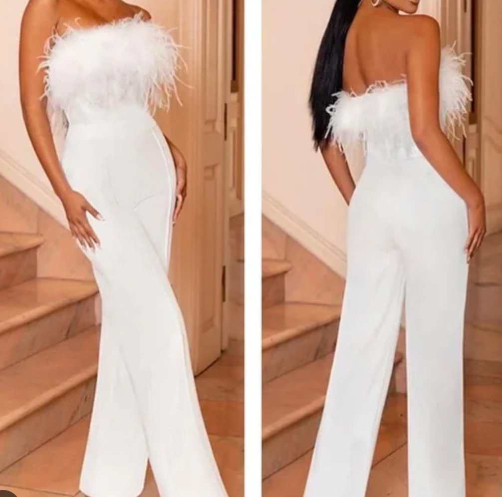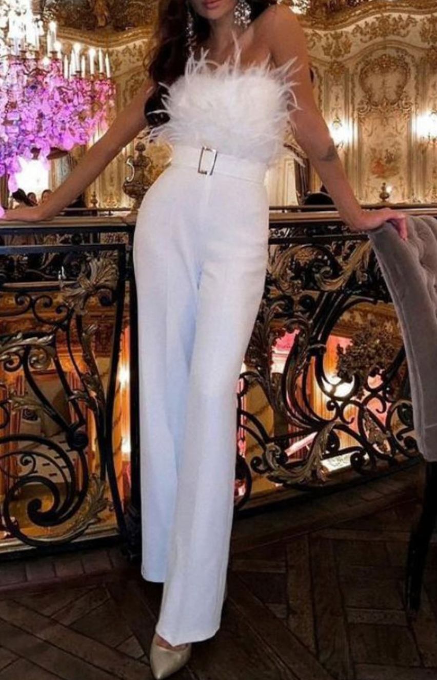 Elevate your wardrobe with this sophisticated belted strapless jumpsuit featuring delicate feather accents. The structured strapless design offers a sleek silhouette, while the adjustable belt cinches the waist for a tailored fit. Feather detailing adds a unique, luxurious texture, making it ideal for special occasions or elegant evenings. Crafted for comfort and style, this jumpsuit combines modern elegance with statement appeal.