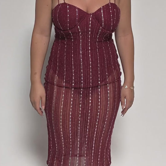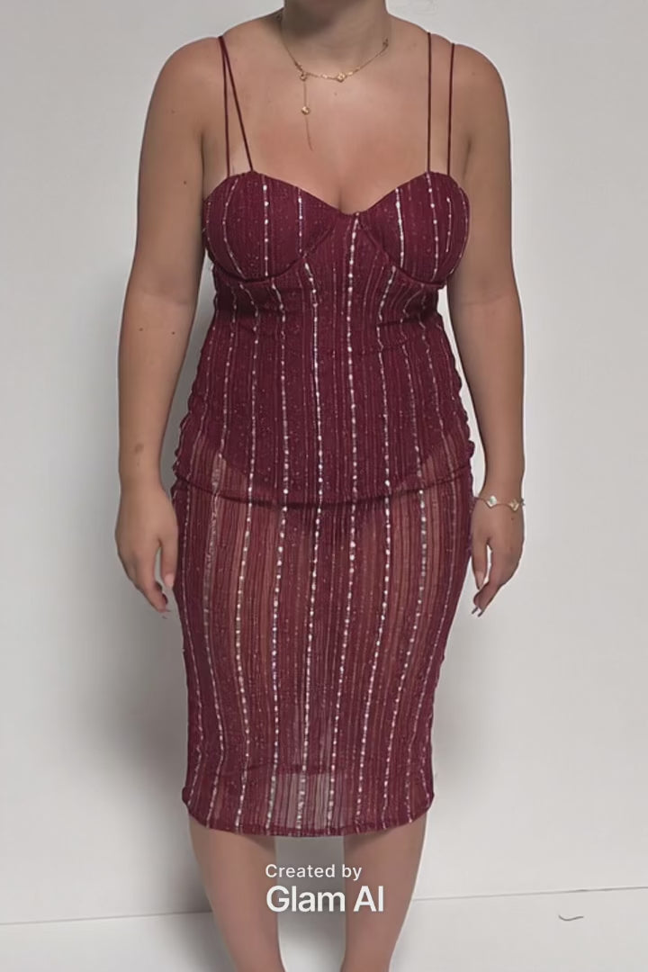 Elevate your evening wardrobe with the Sheer Sequin Corset Midi Dress, expertly tailored to sculpt and flatter your silhouette. This dress features delicate sheer fabric adorned with shimmering sequins, creating a sophisticated, radiant effect. The fitted corset design provides structured support, enhancing your natural curves while maintaining elegance. Ideal for formal events, its midi length offers a balanced blend of modern style and timeless grace. Perfect for making a confident, memorable impression at any special occasion.